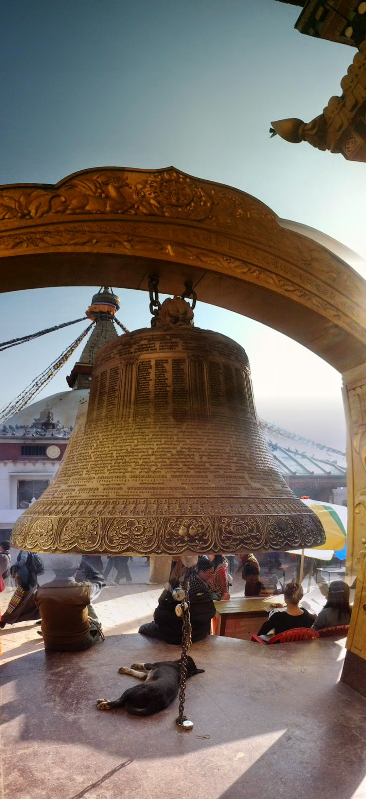 Y un gran cilindro que hay que rodear siguiendo el orden de las agujas del reloj mientras lo vas haciendo girar con la mano derecha y que contiene algunos mantras.